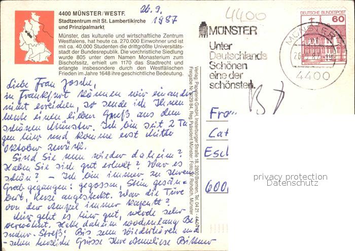 72393231 alte Postkarte Muenster Westfalen Stadtzentrum mit St Lambertikirche und Prinzipalmarkt Fliegeraufnahme postalisch gelaufen Erhaltung siehe scans KatCode: 11110005515000