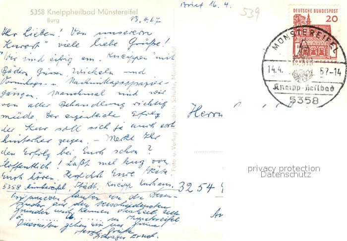 72952955 alte Postkarte Muenstereifel Bad Burg postalisch gelaufen Erhaltung siehe scans [FriedD77] KatCode: 11110005366004