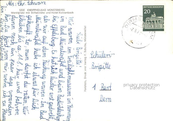72035636 alte Postkarte Muenstereifel Bad Kneippheilbad Marktplatz Stiftskirche Hotel Kolvenbach postalisch gelaufen Erhaltung siehe scans KatCode: 11110005366004