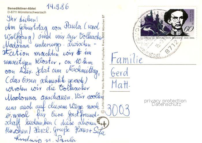 72961761 alte Postkarte Muensterschwarzach Fliegeraufnahme Benediktiner Abtei postalisch gelaufen Erhaltung siehe scans [LiesaD40] KatCode: 11110009675165