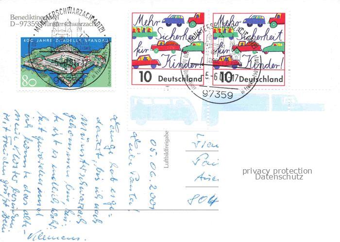 74157714 alte Postkarte Muensterschwarzach Muenster Schwarzach Munster Schwarzach Kloster Abtei Kirche Laufbahn Sportplatz Felder Wohnhaeuser Parkplatz postalisch gelaufen Fliegeraufnahme Erhaltung siehe scans [Karloger] KatCode: 11110009675165