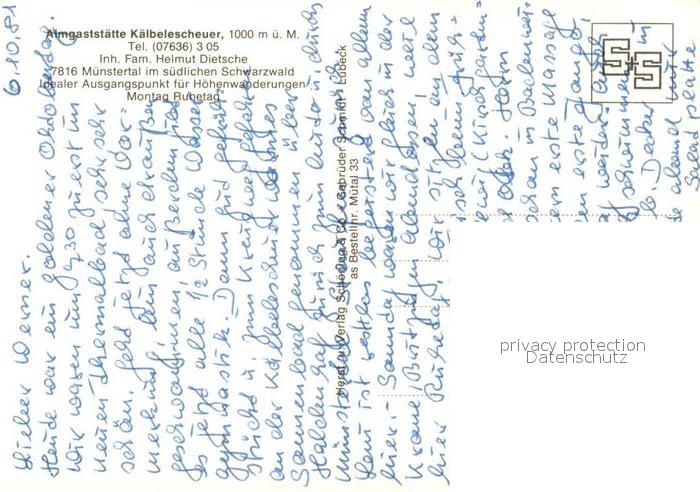 73687979 alte Postkarte Muenstertal Schwarzwald Almgaststaette Kaelbelescheuer postalisch gelaufen Erhaltung siehe scans [WerneD78] KatCode: 11110008315130