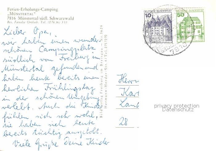 72669049 alte Postkarte Muenstertal Schwarzwald Camping postalisch gelaufen Erhaltung siehe scans [LiesaD40] KatCode: 11110008315130