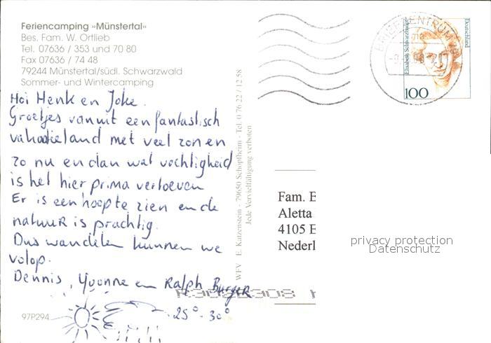 72544686 alte Postkarte Muenstertal Schwarzwald Campingplatz Muenstertal postalisch gelaufen Erhaltung siehe scans [NatalD47 kv014box] KatCode: 11110008315130