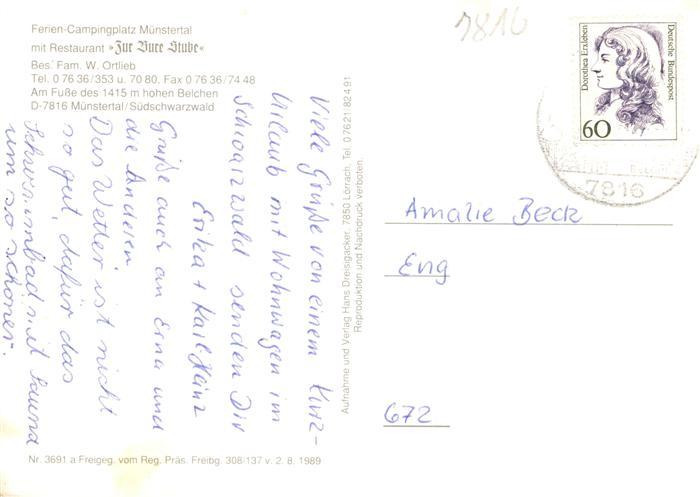73929617 alte Postkarte Muenstertal Schwarzwald Ferien Campingplatz mit Restaurant Bure Stube Gastraeume Hallenbad Fliegeraufnahme postalisch gelaufen Erhaltung siehe scans [WerneD78] KatCode: 11110008315130