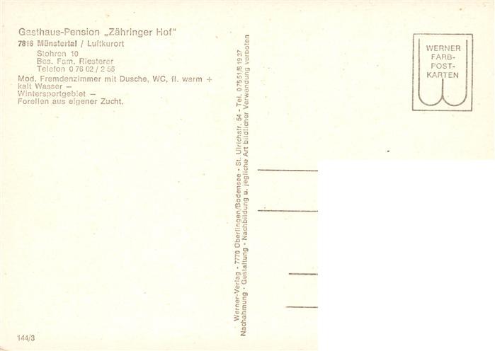 73934746 Muenstertal Schwarzwald Gasthaus Pension Zaehringer Hof postalisch nicht gelaufen Erhaltung siehe scans [WerneD78] KatCode: 11110008315130