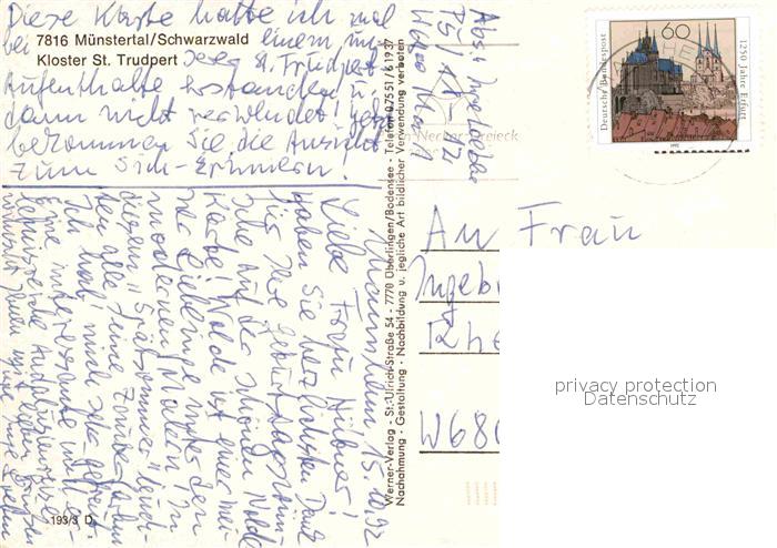 72765317 alte Postkarte Muenstertal Schwarzwald Kloster St Trudpert postalisch gelaufen Erhaltung siehe scans [FriedD77] KatCode: 11110008315130