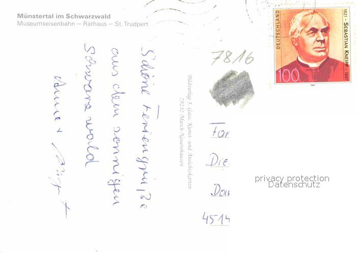 72880178 alte Postkarte Muenstertal Schwarzwald Panorama Museumseisenbahn Rathaus St Trudpert Kloster postalisch gelaufen Erhaltung siehe scans [FriedD77] KatCode: 11110008315130