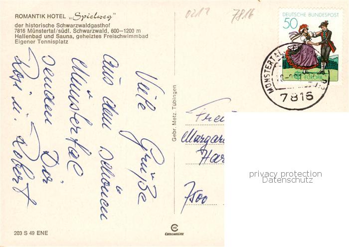 73856238 alte Postkarte Muenstertal Schwarzwald Romantik Hotel Spielweg postalisch gelaufen Erhaltung siehe scans [FriedD77] KatCode: 11110008315130