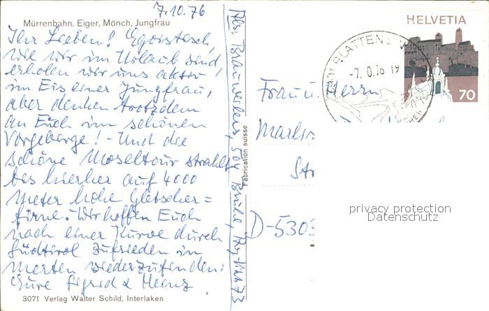 alte Postkarte Muerrenbahn mit Eiger Moench Jungfrau postalisch gelaufen Erhaltung siehe scans