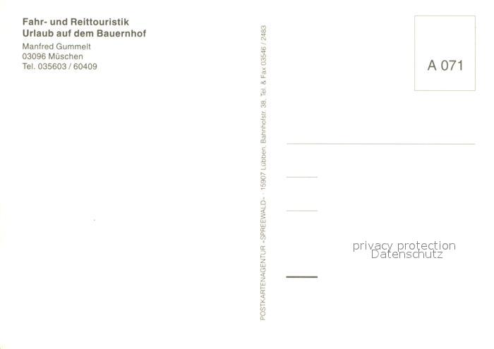73713351 Mueschen Niederlausitz Pferdepension Fahr- und Reittouristik Urlaub auf dem Bauernhof Planwagen postalisch nicht gelaufen Erhaltung siehe scans [FriedD77] KatCode: 11110012071032