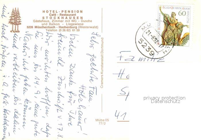 72785552 alte Postkarte Mueschenbach Hotel Pension Stockhausen postalisch gelaufen Erhaltung siehe scans [AndreD76] KatCode: 11110007143269