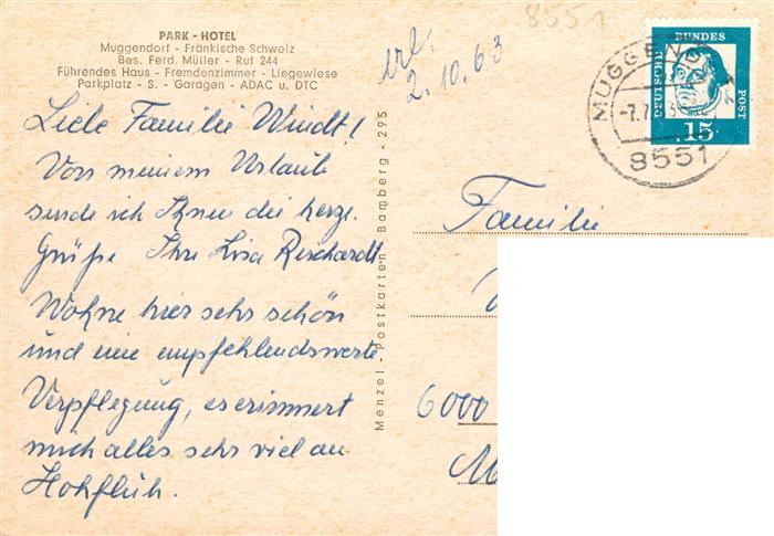 73932271 alte Postkarte Muggendorf Fraenkische Schweiz Park Hotel postalisch gelaufen Erhaltung siehe scans [WerneD78] KatCode: 11110009474176