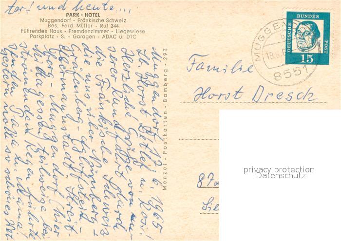 73643338 alte Postkarte Muggendorf Fraenkische Schweiz Park Hotel postalisch gelaufen Erhaltung siehe scans [WerneD78] KatCode: 11110009474176