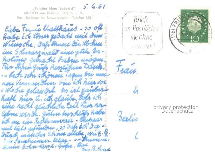 73723856 alte Postkarte Multen Pension Haus Ludovici im Schwarzwald postalisch gelaufen Erhaltung siehe scans [FriedD77] KatCode: 11110008336004