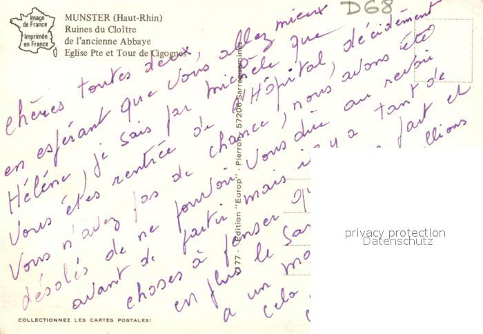 Munster Haut Rhin Elsass Ruines du Cloître de l’ancienne Abbaye Eglise Pointe et Tour de Cigognes postalisch nicht gelaufen Erhaltung siehe scans [FriedD77]
