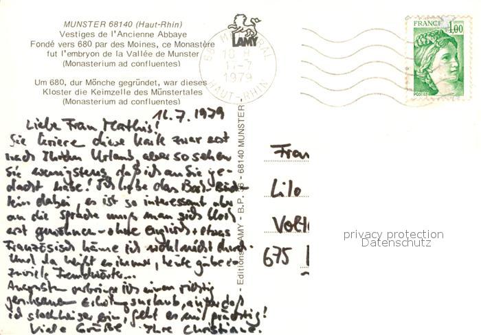 12954566 carte postale Munster Haut Rhin Elsass Vestiges de l’Ancienne Abbaye Monastère Eglise postalisch gelaufen Erhaltung siehe scans [FriedD77] KatCode: 11170068268226