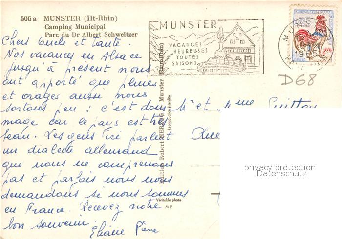 13826095 Munster Muenster 68 Alsace Camping Municipal Parc du Dr Albert Schweitzer postalisch gelaufen Erhaltung siehe scans [FriedD77] carte postale Frie Katcode 11170068268226