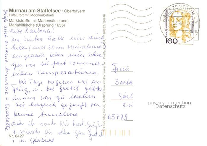 73225845 alte Postkarte Murnau Staffelsee Marktstrasse mit Mariensaeule und Mariahilfkirche postalisch gelaufen Erhaltung siehe scans [WerneD78] KatCode: 11110009180124