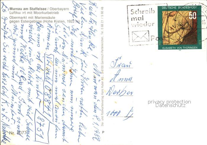 72530662 alte Postkarte Murnau Staffelsee Obermarkt mit Mariensaeule gegen Estergebirge postalisch gelaufen Erhaltung siehe scans [AndreD76 kv009box] KatCode: 11110009180124
