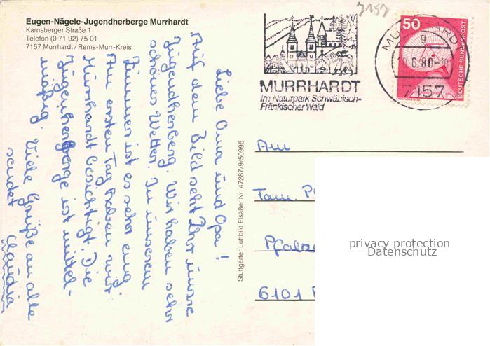 74052872 Murrhardt Rems-Murr-Kreis BW Eugen Naegele Jugendherberge Panorama postalisch gelaufen Erhaltung siehe scans [WerneD78] alte Postkarte Wern Katcode 11110008119044