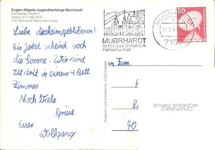 72263448 alte Postkarte Murrhardt Rems-Murr-Kreis BW Fliegeraufnahme Eugen Naegele Jugendherberge postalisch gelaufen Erhaltung siehe scans KatCode: 11110008119044