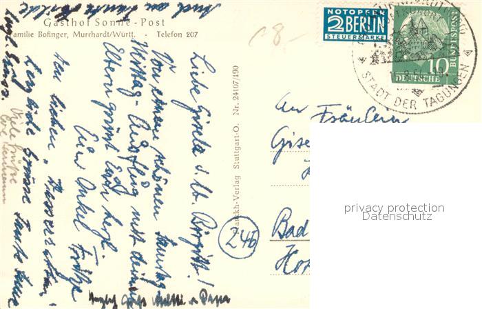 73645112 Murrhardt Rems-Murr-Kreis BW Gasthof Sonne postalisch gelaufen Erhaltung siehe scans [WerneD78] alte Postkarte Wern Katcode 11110008119044