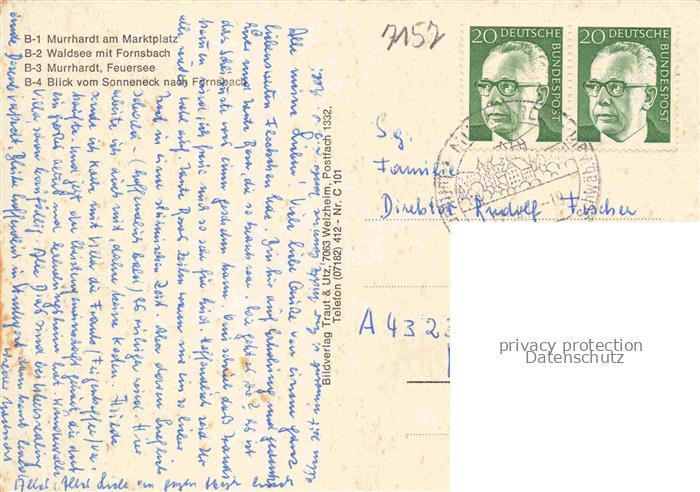 74052712 Murrhardt Rems-Murr-Kreis BW Marktplatz Waldsee mit Fornsbach Feuersee Sonneneckblick nach Fornsbach postalisch gelaufen Erhaltung siehe scans [WerneD78] alte Postkarte Wern Katcode 11110008119044