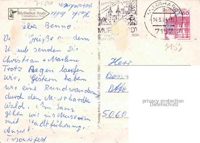 74052878 Murrhardt Rems-Murr-Kreis BW Walterichskirche Hoerschbach Wasserfall Sonne Post Freibad Ruemelinsmuehle Marktplatz Jugendherberge postalisch gelaufen Erhaltung siehe scans [WerneD78] alte Postkarte Wern Katcode 11110008119044