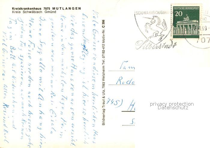 73739776 alte Postkarte Mutlangen Kreiskrankenhaus Schwesternwohnungen Teilansicht Eingangshalle Kath Kapelle Ev Kapelle postalisch gelaufen Erhaltung siehe scans [WerneD78] KatCode: 11110008136044