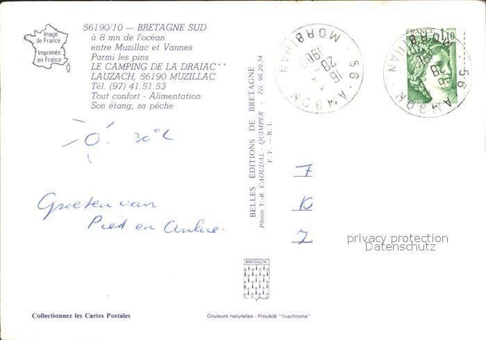 12035591 carte postale Muzillac Camping de la Draiac Blockhaus See Zeltplatz postalisch gelaufen Erhaltung siehe scans KatCode: 11170056356143