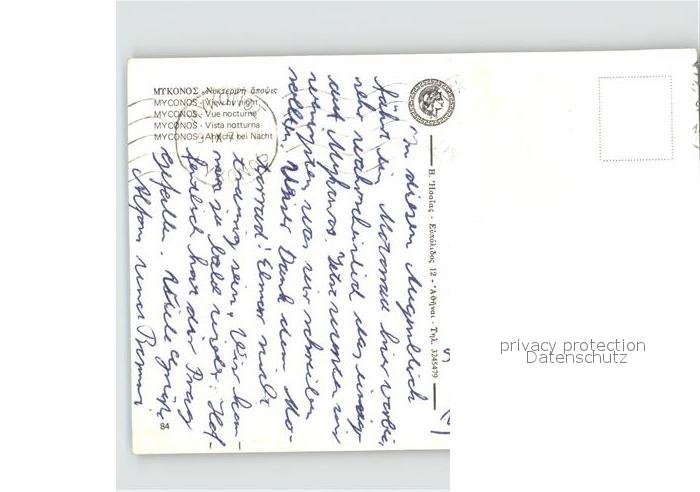 old postcard Myconos Panorama Hafen bei Nacht postalisch gelaufen