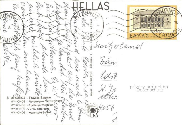 old postcard Mykonos Kykladeninsel aegaeis Malerische Strasse postalisch gelaufen Erhaltung siehe scans