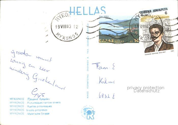 old postcard Mykonos Kykladeninsel aegaeis Ortspartie postalisch gelaufen Erhaltung siehe scans