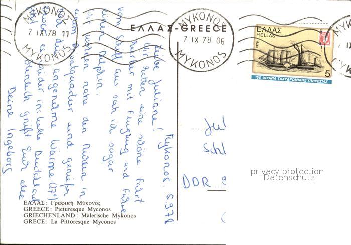 old postcard Mykonos Kykladeninsel aegaeis Panorama postalisch gelaufen Erhaltung siehe scans