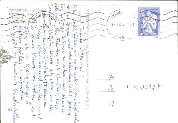 old postcard Mykonos Kykladeninsel aegaeis Strassenpartie postalisch gelaufen Erhaltung siehe scans