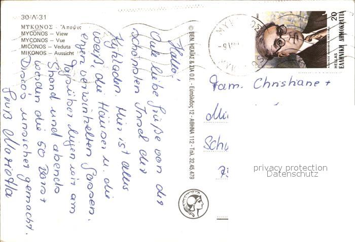 old postcard Mykonos Kykladeninsel aegaeis Teilansicht aus dem Festungsbogen postalisch gelaufen Erhaltung siehe scans