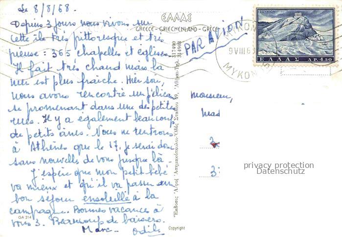 74015112 old postcard Mykonos Micono Myconos Greece Windmuehle Pelikan Panorama Ortspartie postalisch gelaufen Erhaltung siehe scans [FriedD77] KatCode: 11190