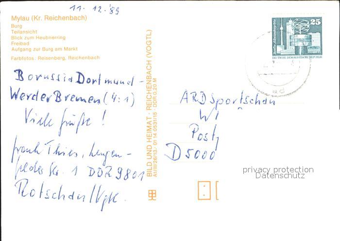 72461662 alte Postkarte Mylau Burg Blick zum Heubnerring Freibad Burg am Markt postalisch gelaufen Erhaltung siehe scans KatCode: 11110014178390