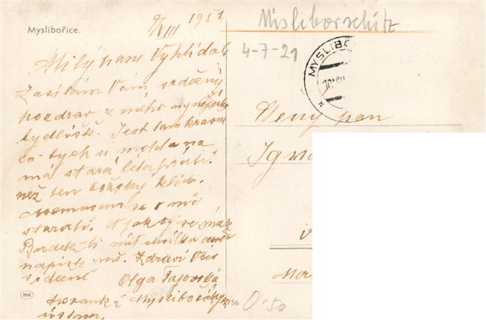 73959442 old postcard Mysliborice Trebic Trebitsch CZ Partie am Teich Blick zur Kirche postalisch gelaufen Erhaltung siehe scans [FriedD77] KatCode: 11520