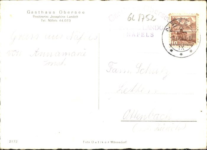 10892163 alte Postkarte Naefels asthaus Obersee postalisch gelaufen KatCode: 11470090300900
