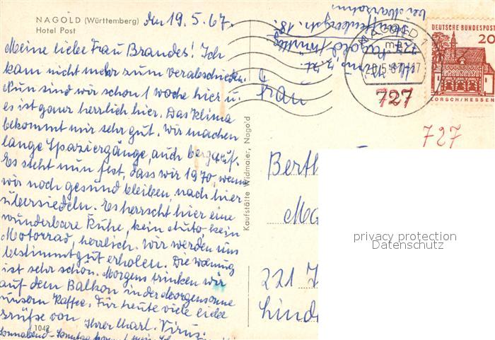 72971303 alte Postkarte Nagold Hotel Post postalisch gelaufen Erhaltung siehe scans [PaolaD17] KatCode: 11110008235046