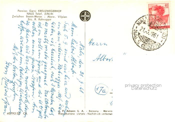 13624046 Nals Bozen Pension-Garni Kreuzwegerhof postalisch gelaufen Erhaltung siehe scans [PaolaD17] old postcard Paol Katcode 11240