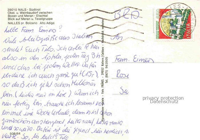 74013679 old postcard Nals Nalles Suedtirol IT Panorama Etschtal Blick auf Meran und Texelgruppe postalisch gelaufen Erhaltung siehe scans [FriedD77] KatCode: 11240