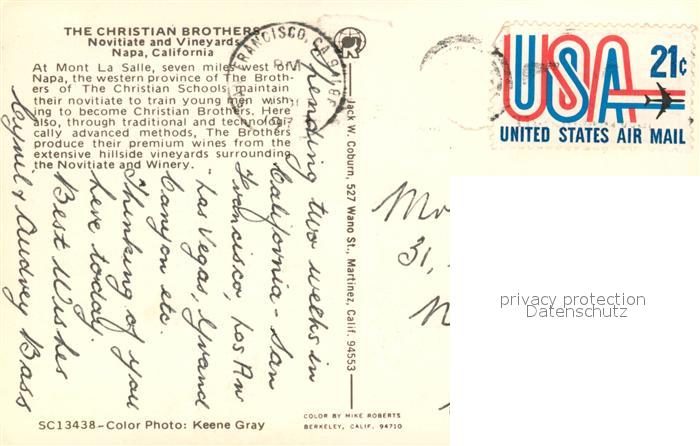 73131746 old postcard Napa Christian Brothers Novitiate and Vineyards Mount La Salle postalisch gelaufen Erhaltung siehe scans [FriedD77] KatCode: 14140050000000