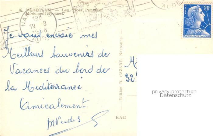 13534846 carte postale Narbonne Aude Les Trois Ponts et Monument Farrout postalisch gelaufen Erhaltung siehe scans [WerneD78] KatCode: 11170011311262