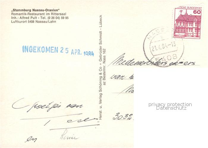 72930018 alte Postkarte Nassau Lahn Stammburg Nassau Oranien postalisch gelaufen Erhaltung siehe scans [WerneD78] KatCode: 11110007141091