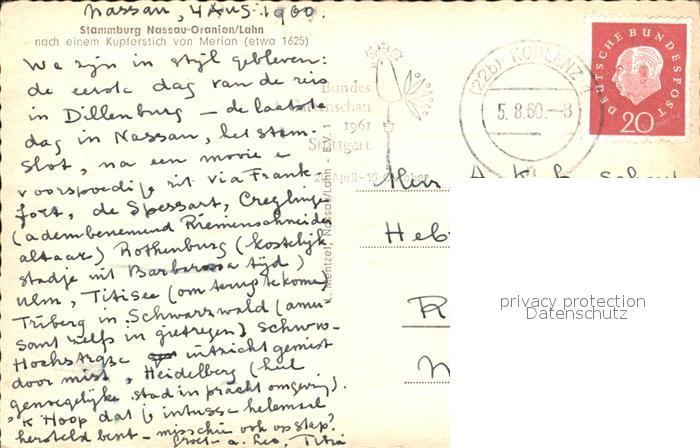 72402782 alte Postkarte Nassau Lahn Stammburg Nassau Oranien Stein Schloss nach Kupferstich Merian Kuenstlerkarte postalisch gelaufen Erhaltung siehe scans KatCode: 11110007141091