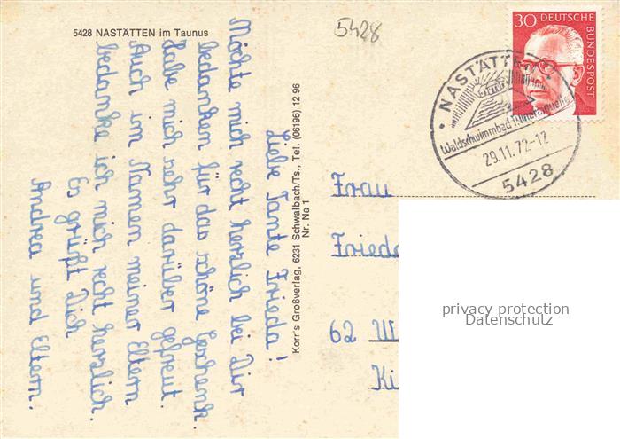 74050854 alte Postkarte Nastaetten Taunus Rheinland-Pfalz Panorama Rathaus Schwesternhaus Krankenhaus Waldschwimmbad postalisch gelaufen Erhaltung siehe scans [WerneD78] KatCode: 11110007141092