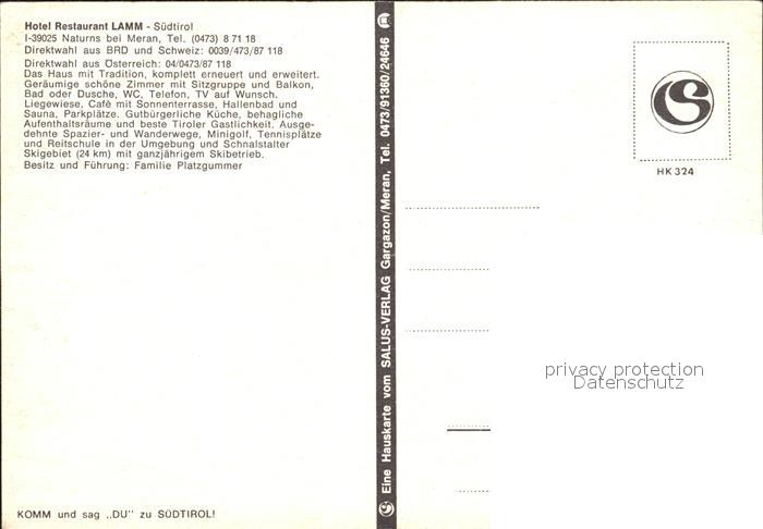Naturns Hotel Restaurant Lamm postalisch nicht gelaufen Erhaltung siehe scans